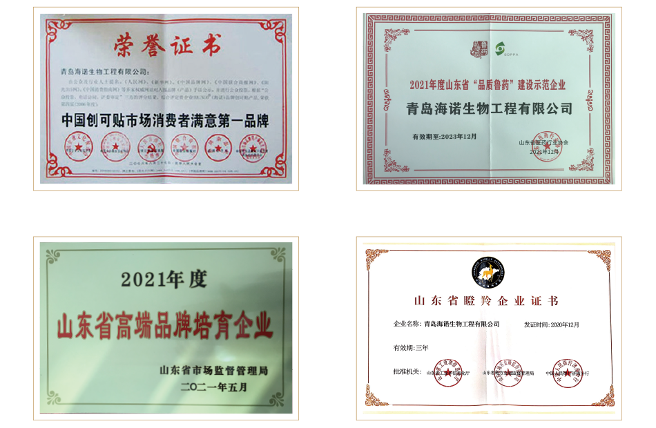 海氏海諾集團先后獲得青島市守合同重信用企業、青島市優秀民營企業、中國醫用敷料行業杰出品牌、中國優秀民營企業、中國醫療器械行業最具創新活力競爭力前三強企業、中國馳名商標、山東省高端品牌培育企業、山東省“品質魯藥”建設示范企業、國家級“專精特新”小巨人等榮譽和獎項。