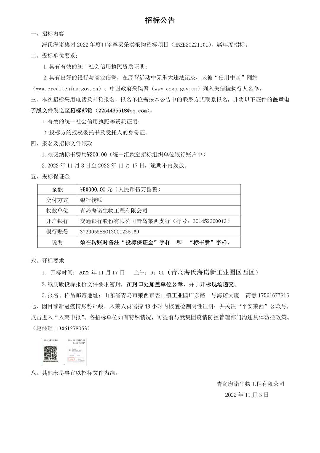2022.11.04海氏海諾集團(tuán) 2022 年度口罩鼻梁條類采購招標(biāo)項(xiàng)目正式開啟,屆時(shí)我們將秉承公正、公平、公開、透明的招標(biāo)原則,期待優(yōu)秀供應(yīng)商的廣泛參與。具體招標(biāo)細(xì)節(jié)如下: