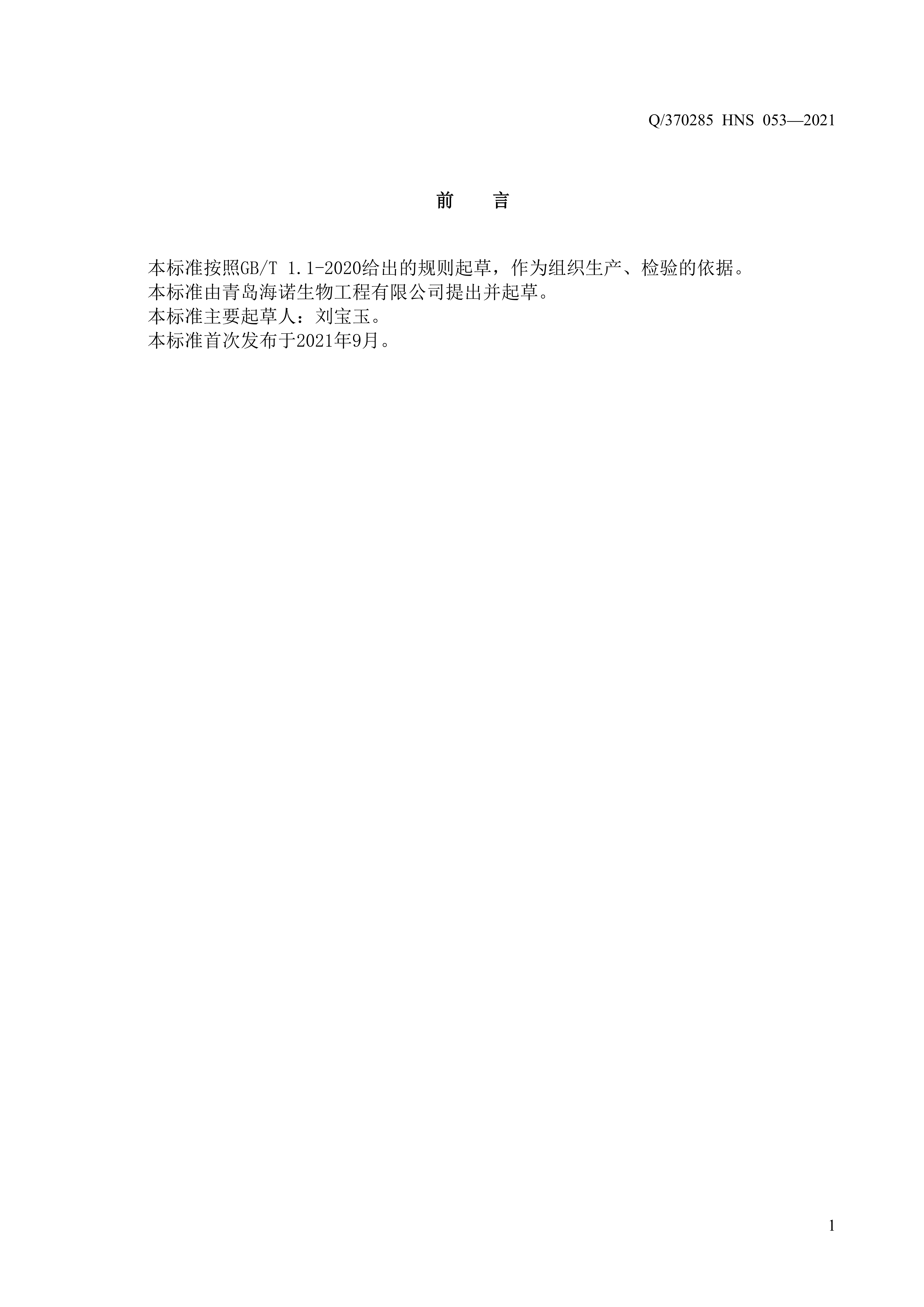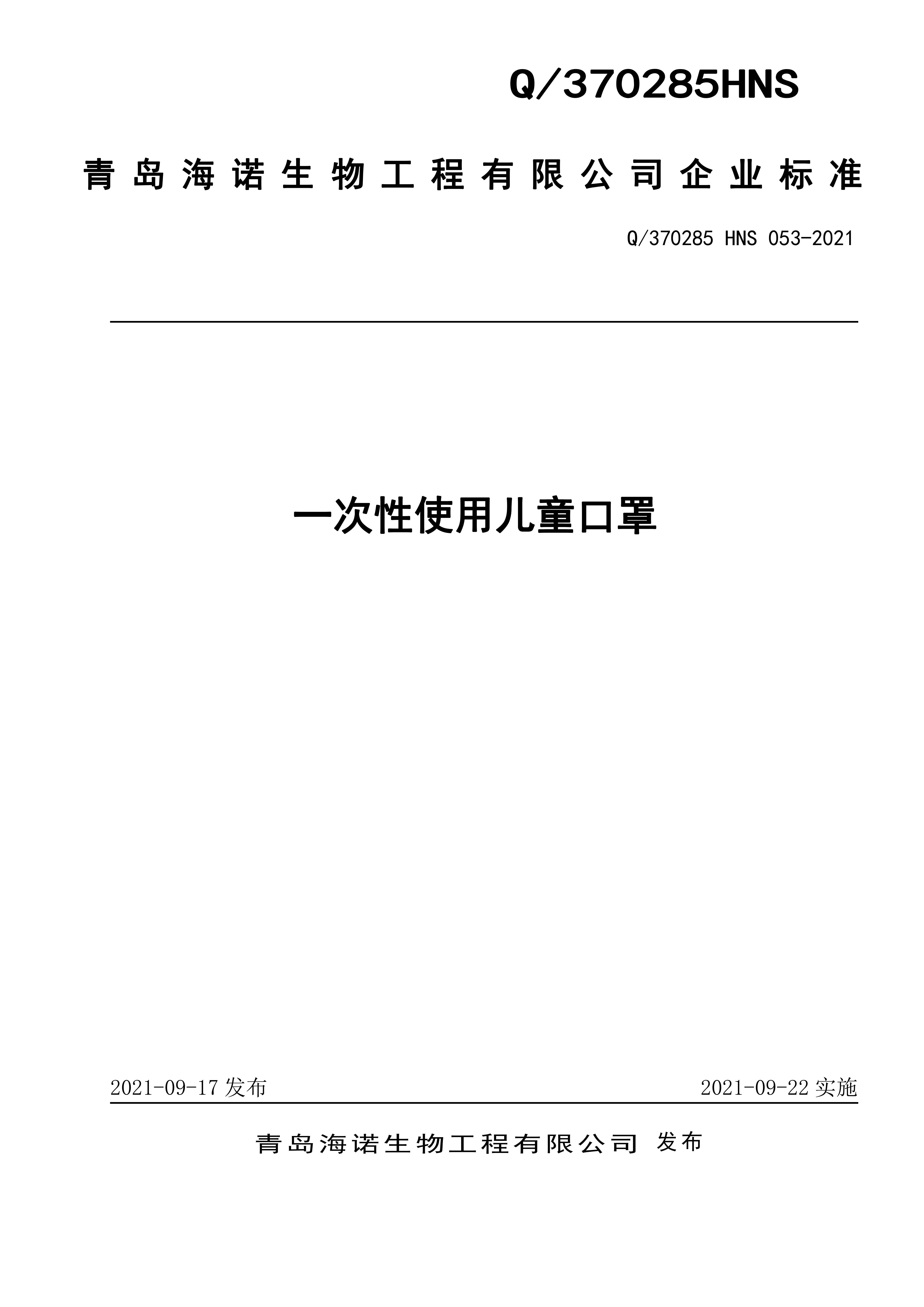 青島海諾生物工程有限公司企業(yè)標準 — 一次性使用兒童口罩