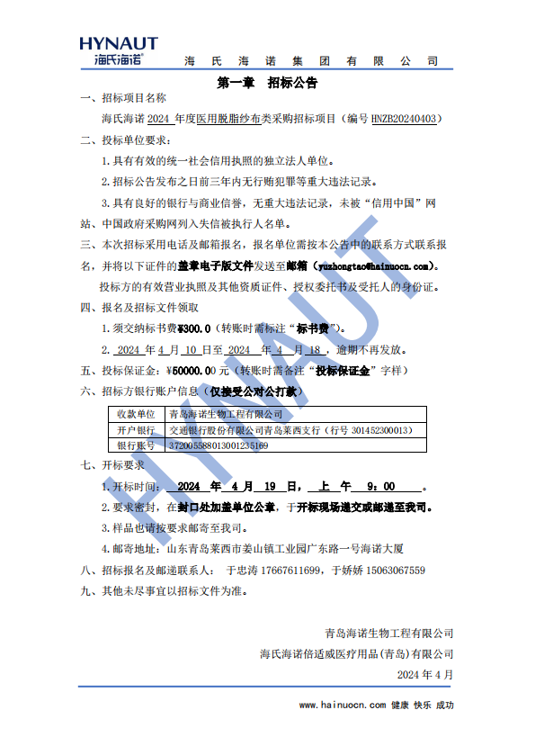 海氏海諾醫用脫脂紗布類采購項目招標公告