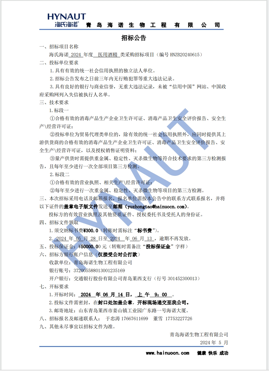 海氏海諾2024年度醫用酒精類采購招標項目(編號 HNZB20240615)